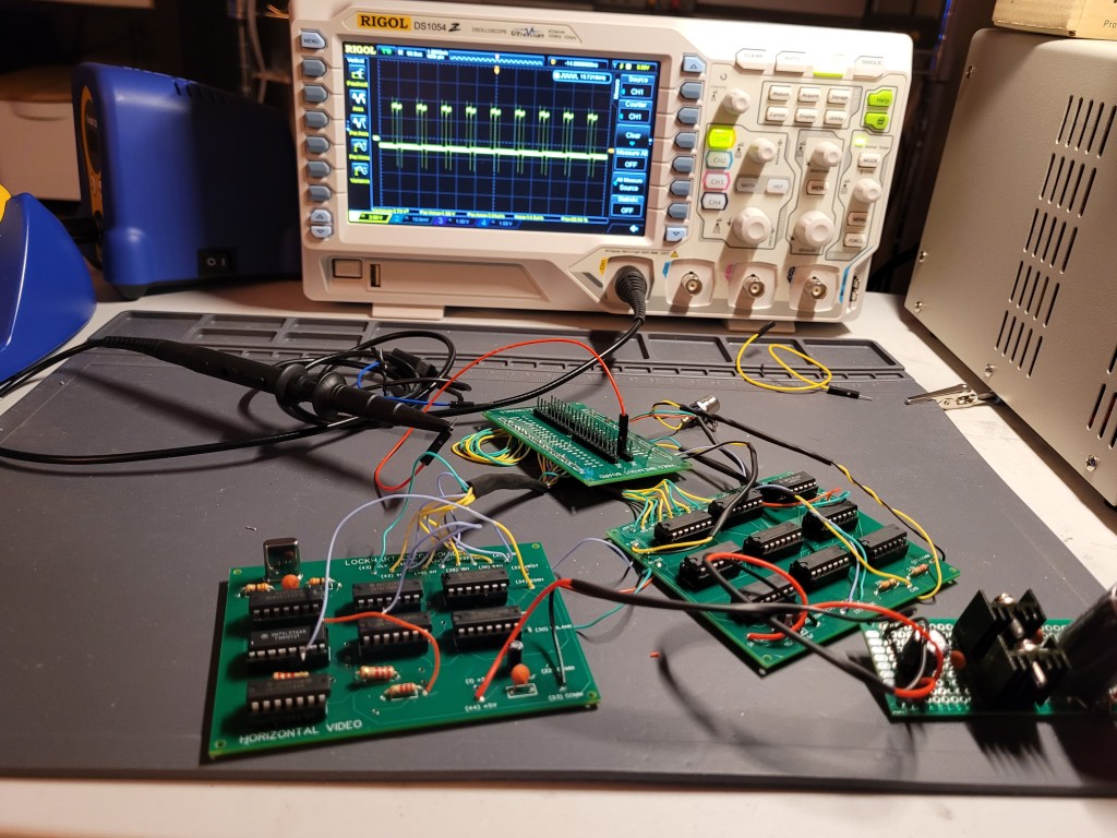 I walked away for a bit to allow my brain to relax before I started furiously diving in to poke and prod indiscriminately in a clumsy attempt at troubleshooting. Eventually, I came back in and poked around gently with my oscilloscope, to see if I was getting any signal from the various video outputs. Nothing. That led me to the first step any troubleshooter should take on a project: making sure everything is getting the power it needs. The first thing I noticed was that the resistors marked 470k were totally incorrect – the schematic called for 2.2k ohm resistors. No idea where I got the 470k from. But much more importantly, 74LS74 on the Horizontal board wasn’t getting the 5V it needed. A quick bodge solution solved that, and the horizontal signals came alive! Huzzah!
