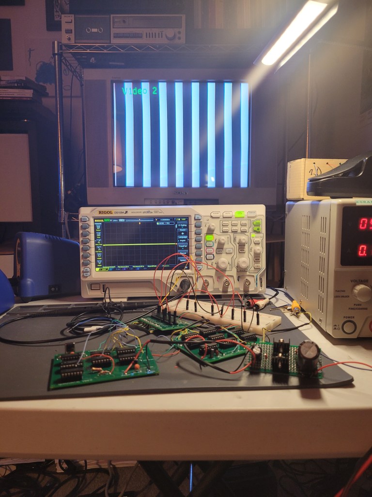BUT – still no picture. The vertical lines weren’t producing anything. First off, one of the 74LS93 chips on the vertical board had been put in backwards. Whoops. But I still wasn’t getting anything. I checked everything trying to find out what was wrong, until I noticed I wasn’t getting anything from Horizontal Reset. Poking around further on the horizontal board showed that 256H wasn’t doing anything, and that signal is generated by the 7476 IC. Was that chip bad? I cross referenced with the chip’s pinout and a similar implementation of this build, and I noticed something – the schematic was wrong! Pins 6 and 9 had been mistakenly swapped! Pulling out those pins and rerouting them managed to throw a picture up on the screen!