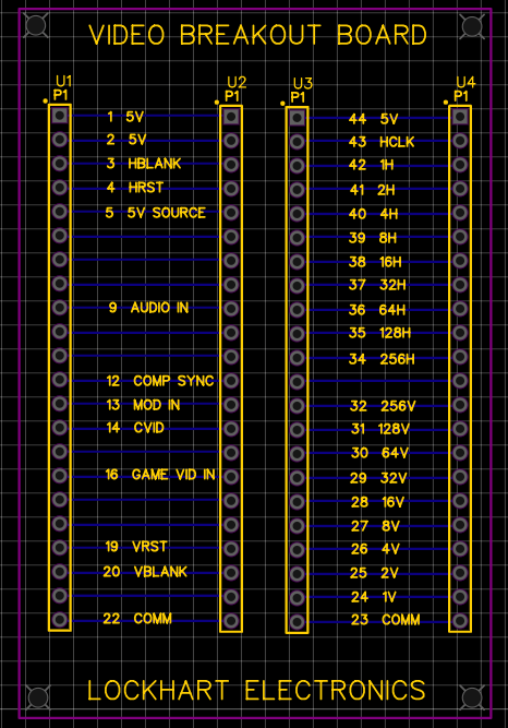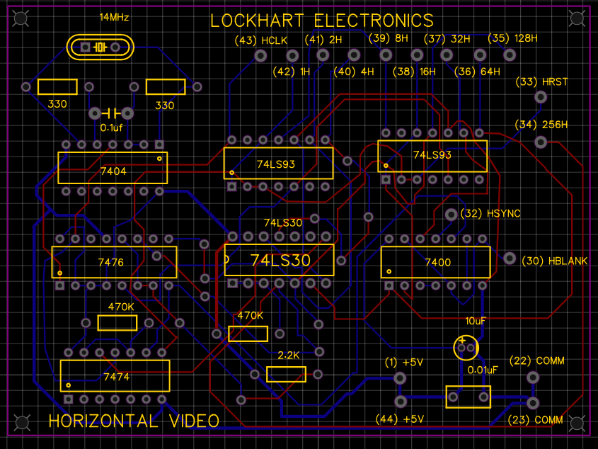 So…. where to begin? The book has as it it’s initial project, the “Sourcebox”, which is an analog composite video generator based on TTL logic that all the other projects in the book rely on. The book recommends doing this as three separate boards (horizontal video, vertical video, and power) and those boards are wired to a 44-pin card edge connector socket. The schematics are bigger than anything I had ever tried to build from scratch using perfboard or breadboards, so I thought it might be easier if I instead designed my own custom PCBs. So I watched a couple videos, downloaded EasyEDA, and I was in business! Learning the software and the process of designing went a lot smoother than I expected it to go, and if anyone is curious to try it I highly encourage taking the plunge, it’s fun!