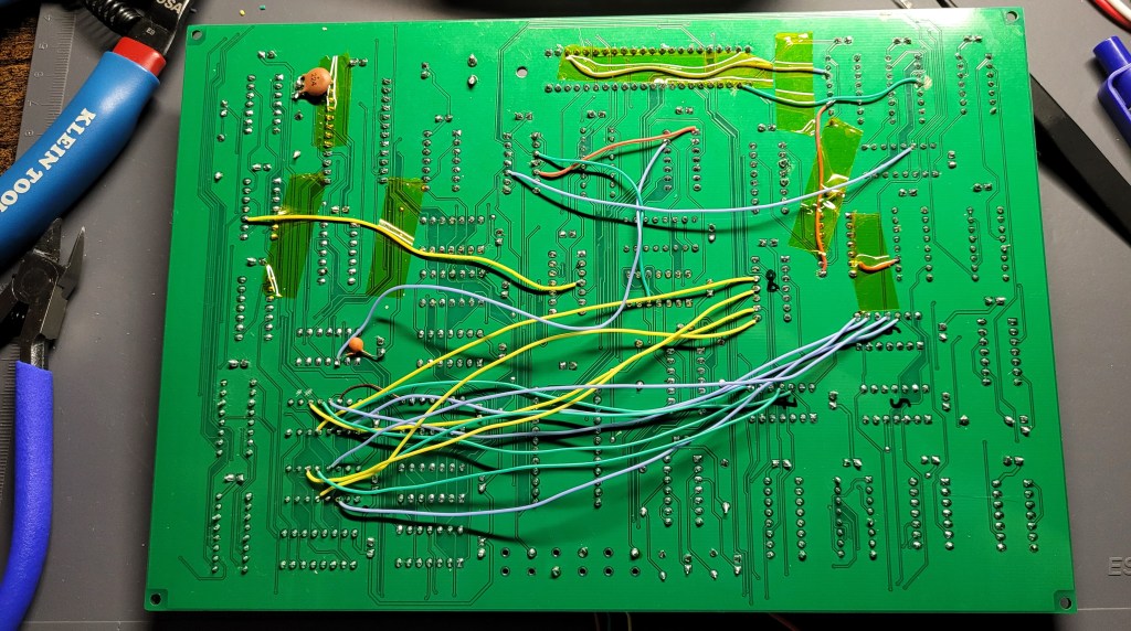 And there we have it. A ball moving bidirectionally on each axis, and a playable game. The score isn’t looking right in this example; that would turn out to be another error in the schematic. The outputs from the score and ball counter going to the score display circuit were backwards. That required the tedious task of cutting traces and soldering bodge wires, but compared to the previous task of just getting the ball to do what it was supposed to, this was a walk in the park. I also made up a quick sound board so it would look more complete. Without further ado, here are the photos of the build itself, the web of bodges on the back of the board, and some footage of gameplay: